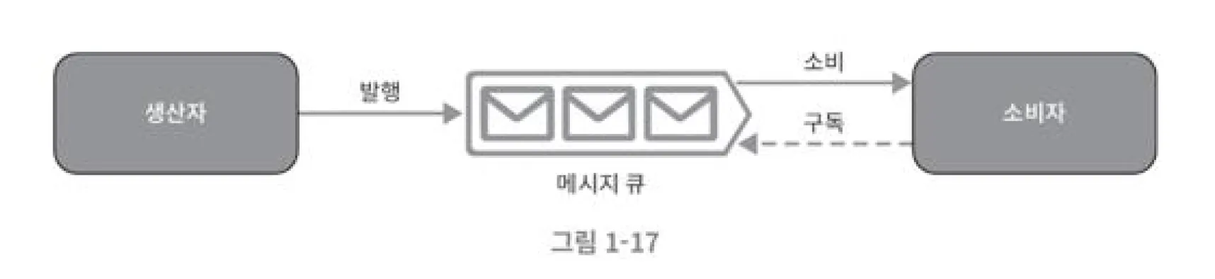 - 소비자(또는 구독자)라고 불리는 서비스가 메시지를 받아 그에 맞는 동작을 수행