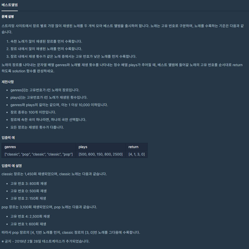 [프로그래머스] 해시 Level 3. 베스트앨범(JAVA) 본문
