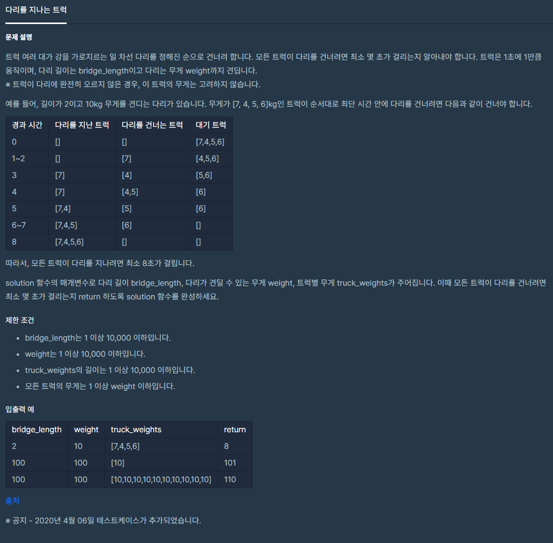 다리길이 + 진입시간 = 현재시간이면 트럭이 다리를 모두 건넌 것이므로 Queue에서 제거하고 총무게를 뺀다.